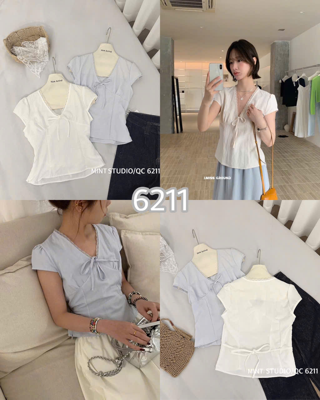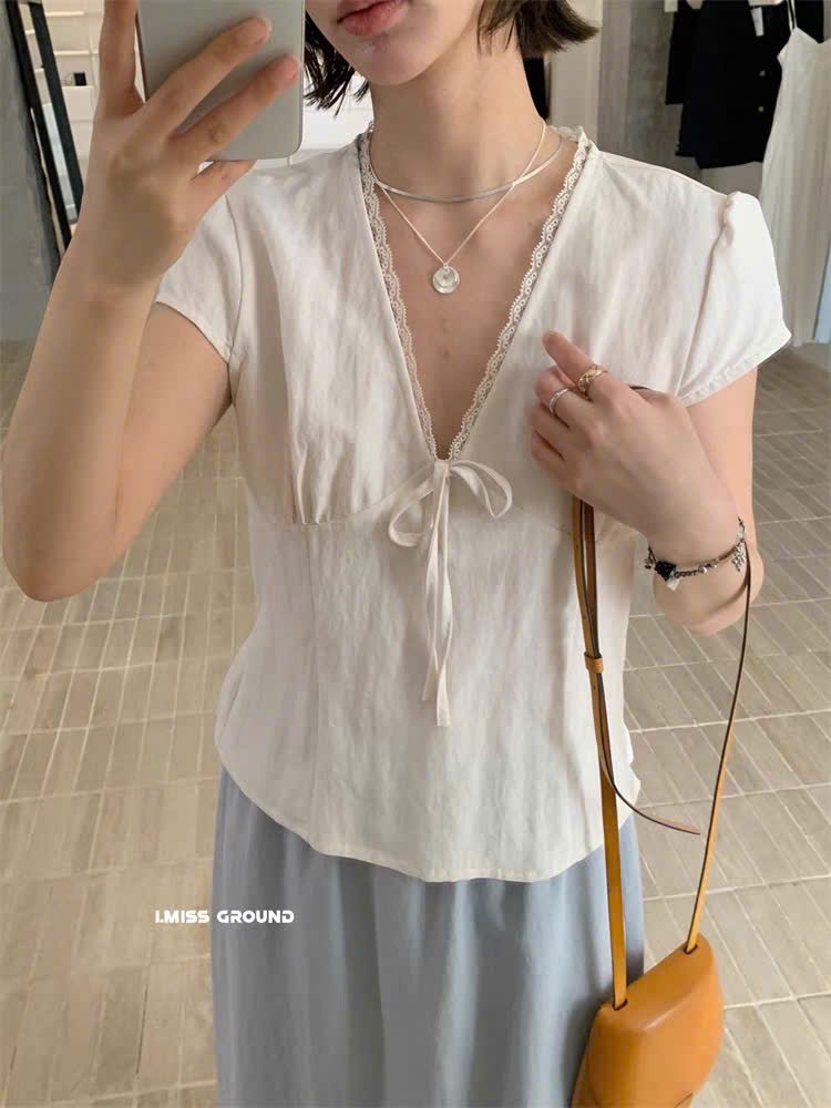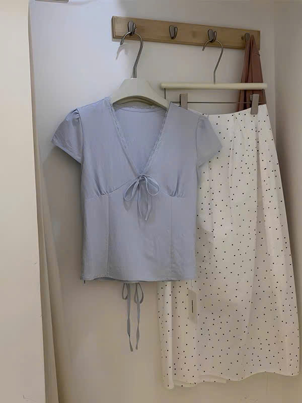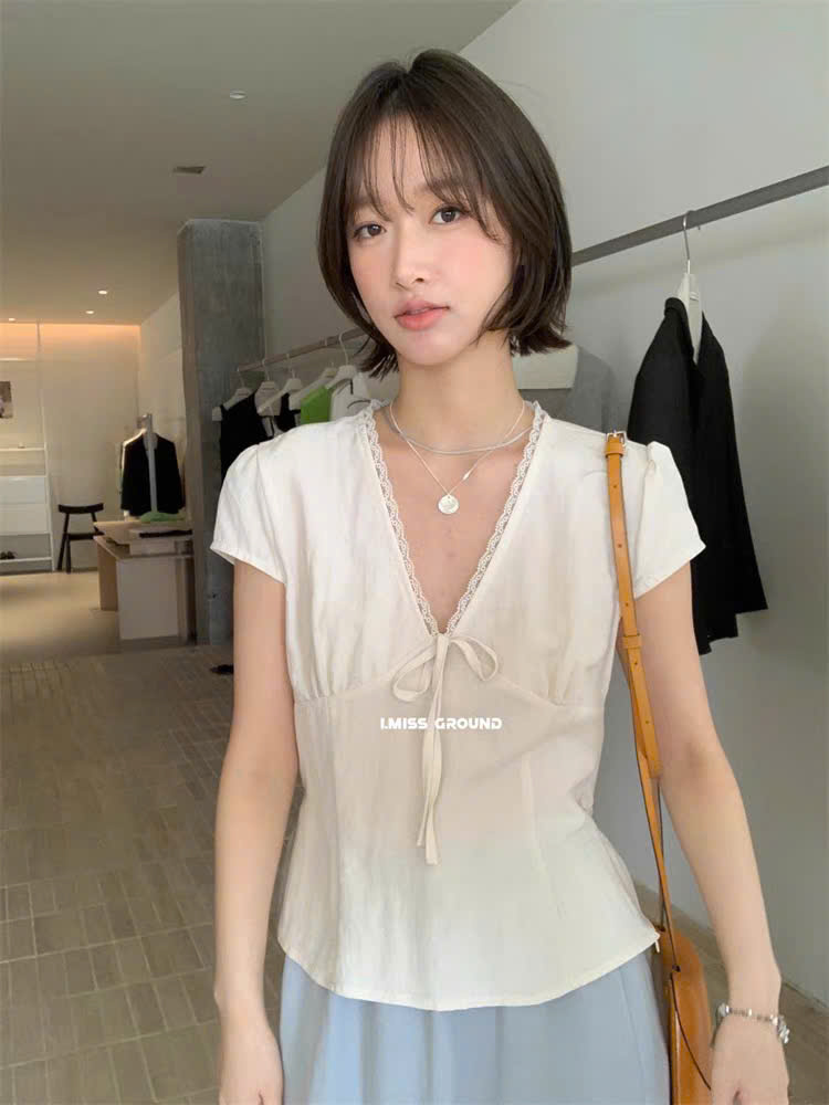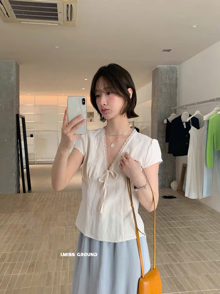 ÁO ĐŨI CỔ V VIỀN REN THẮT NƠ EO MÃ 6211