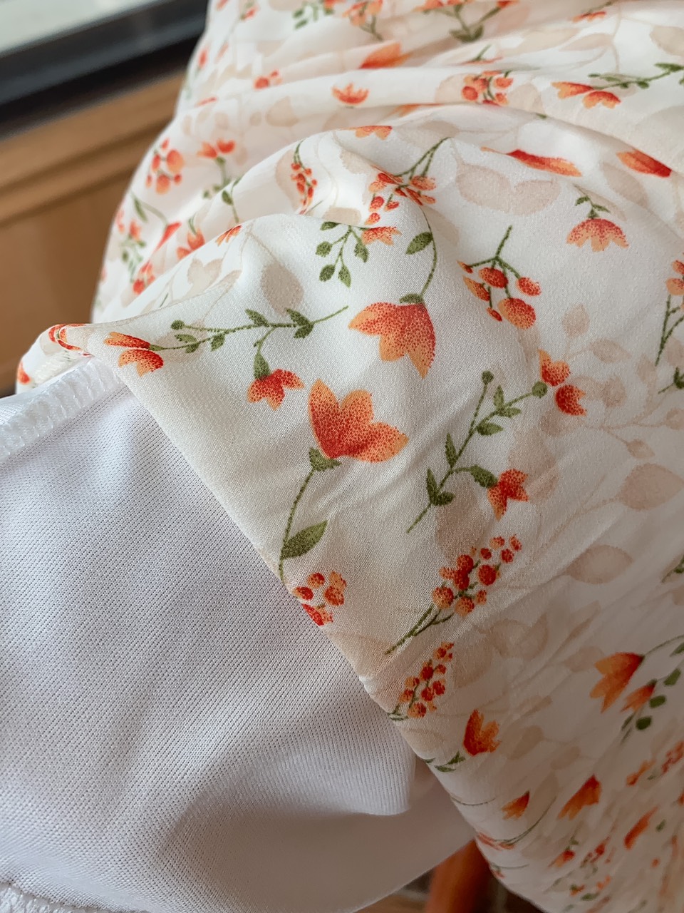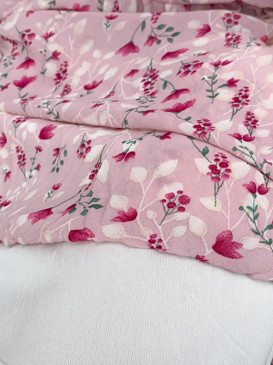 ➖ Chất vải chiffon mềm mịn mát, bên trong có lớp lót, hoạ tiết hoa rủ xuống đan xen xinh xắn lắm ạ