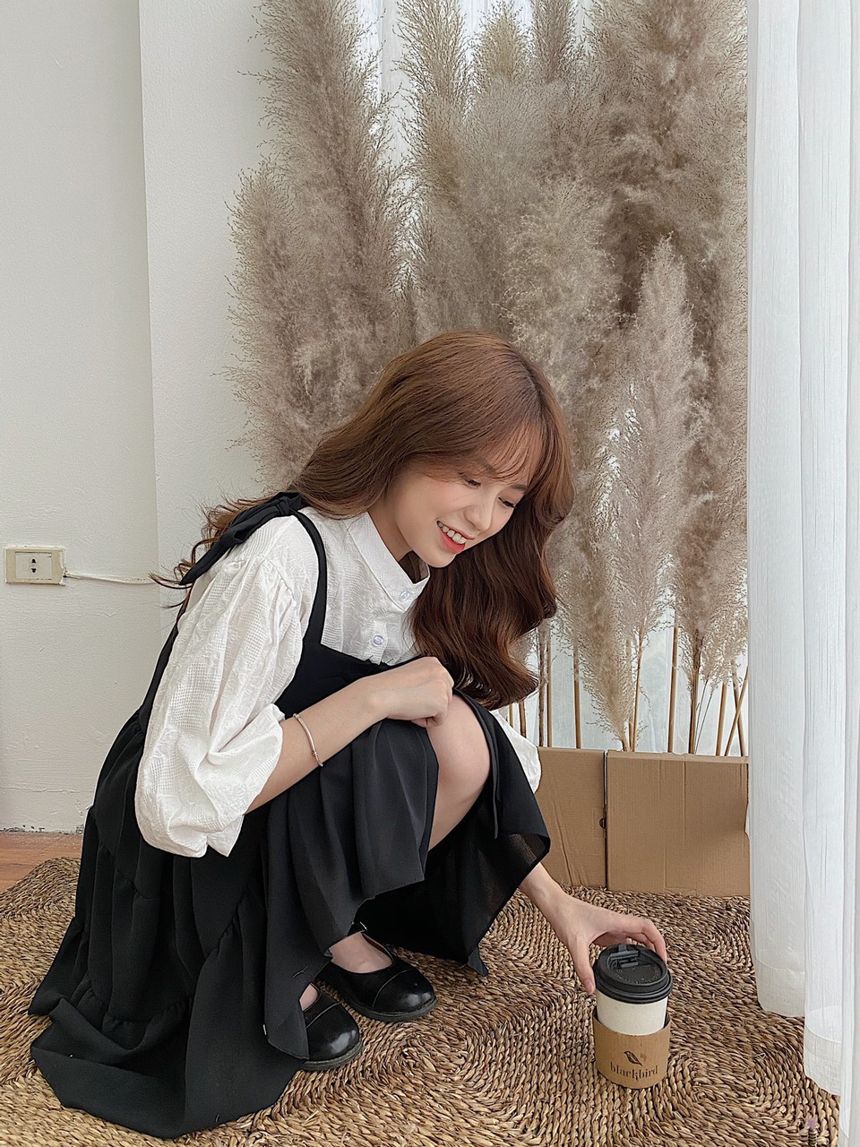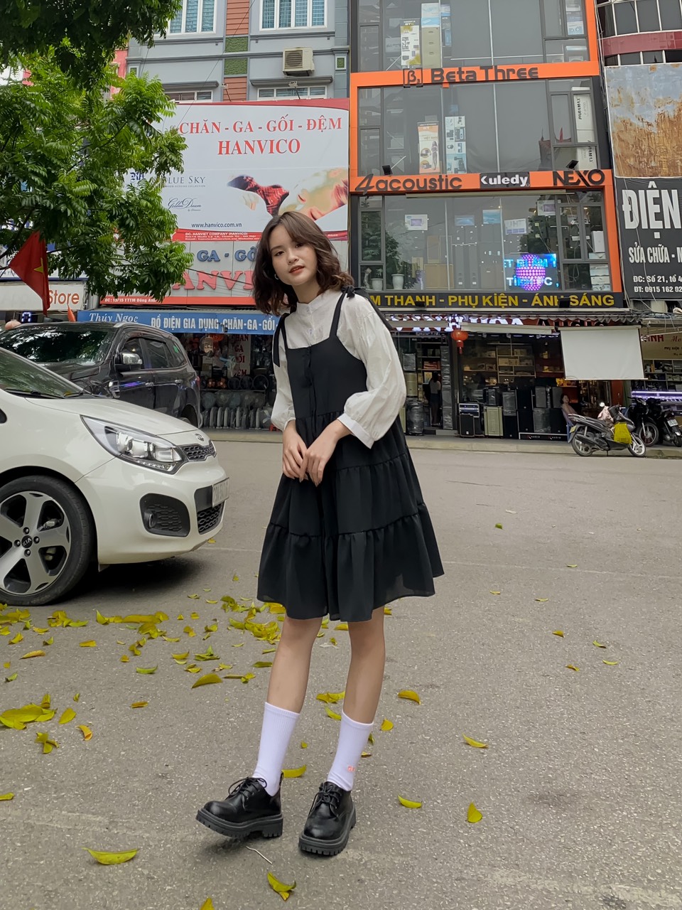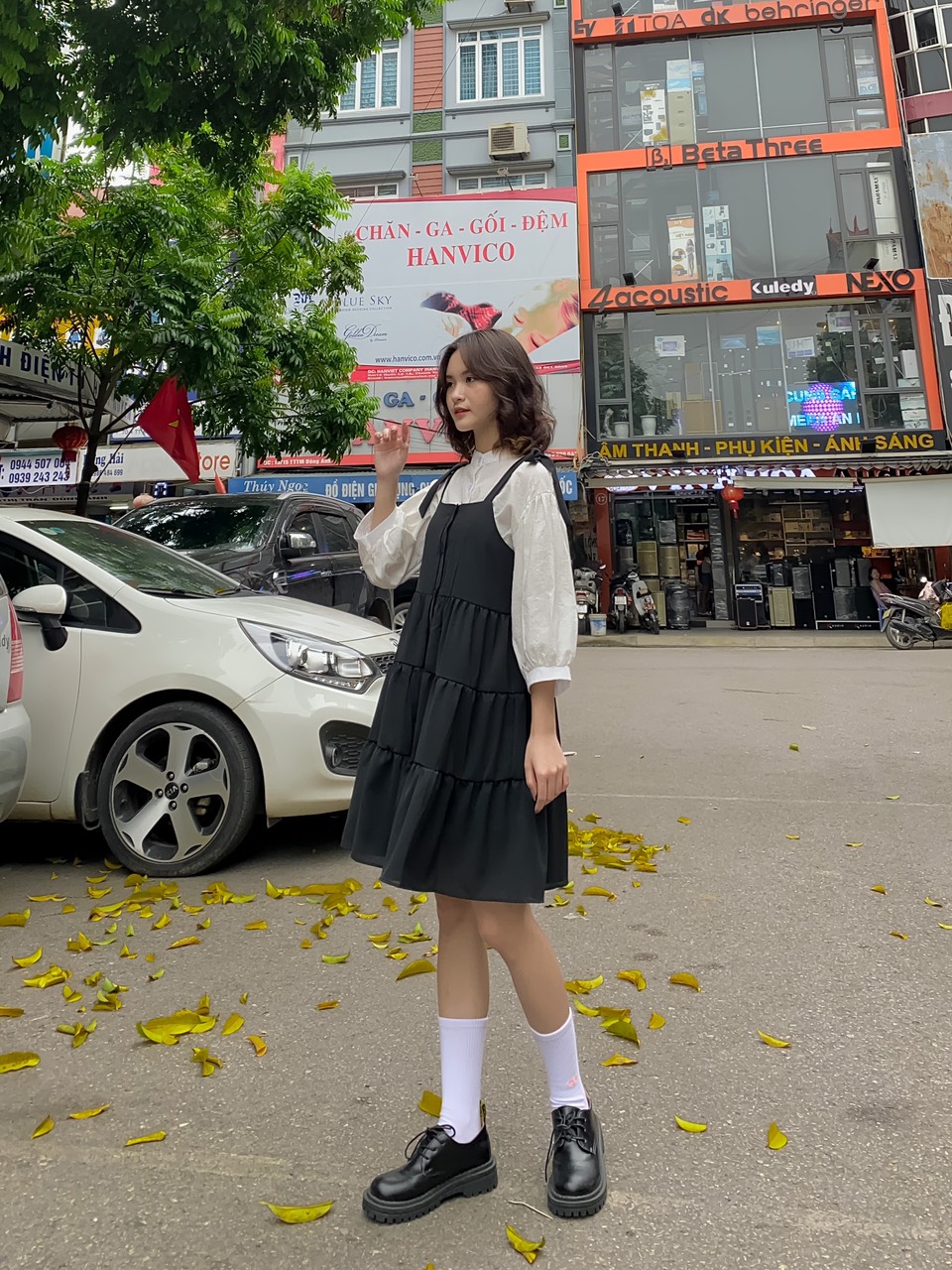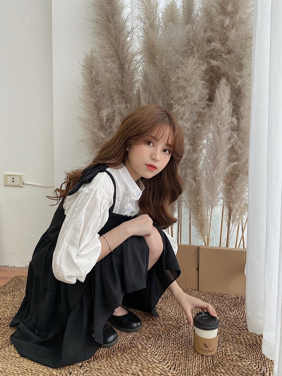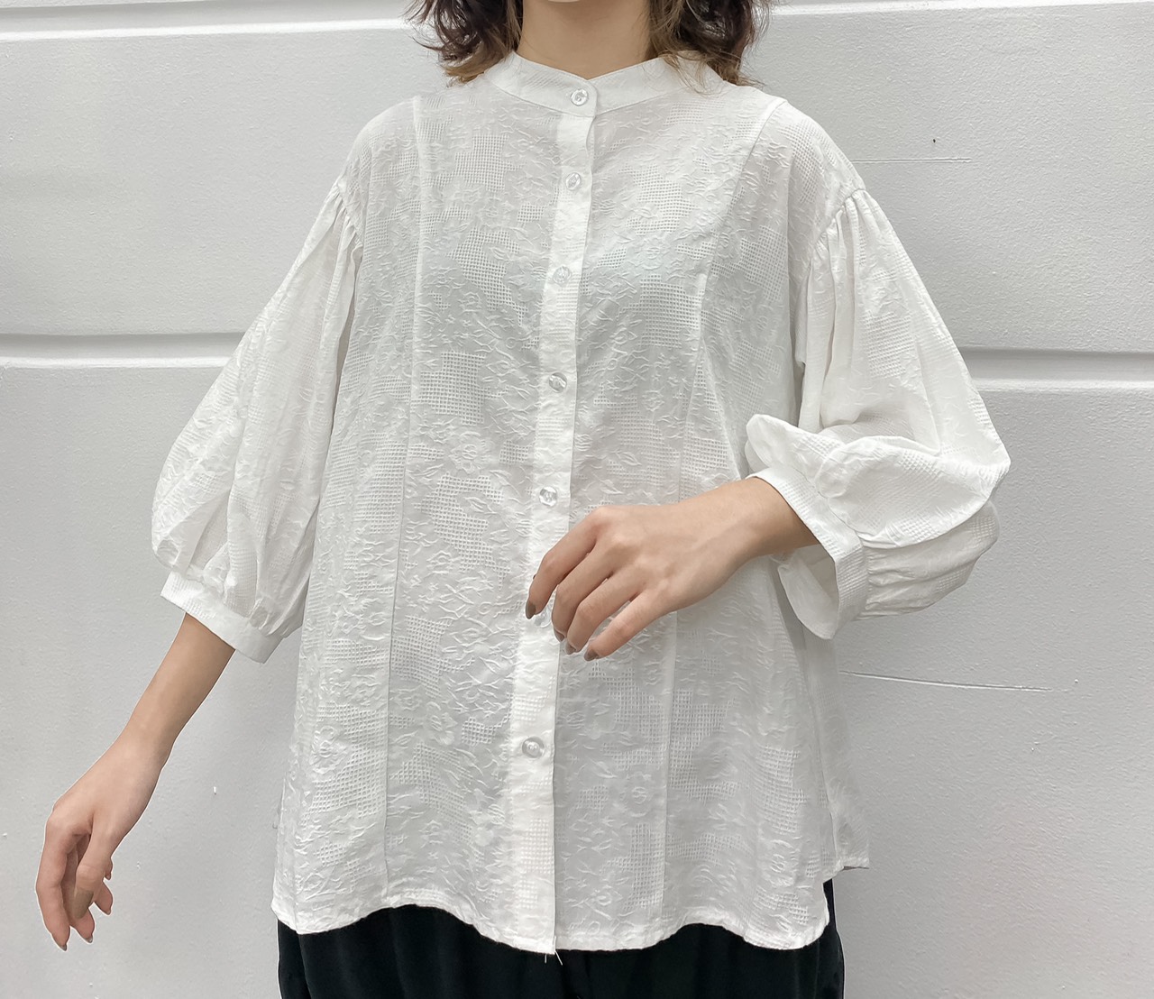 ➖ Áo sơ mi trắng cổ tàu form rộng hoạ tiết nổi vải dày dặn không lộ bên trong, tay bo phồng xinh xắn lắm