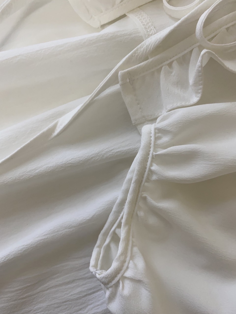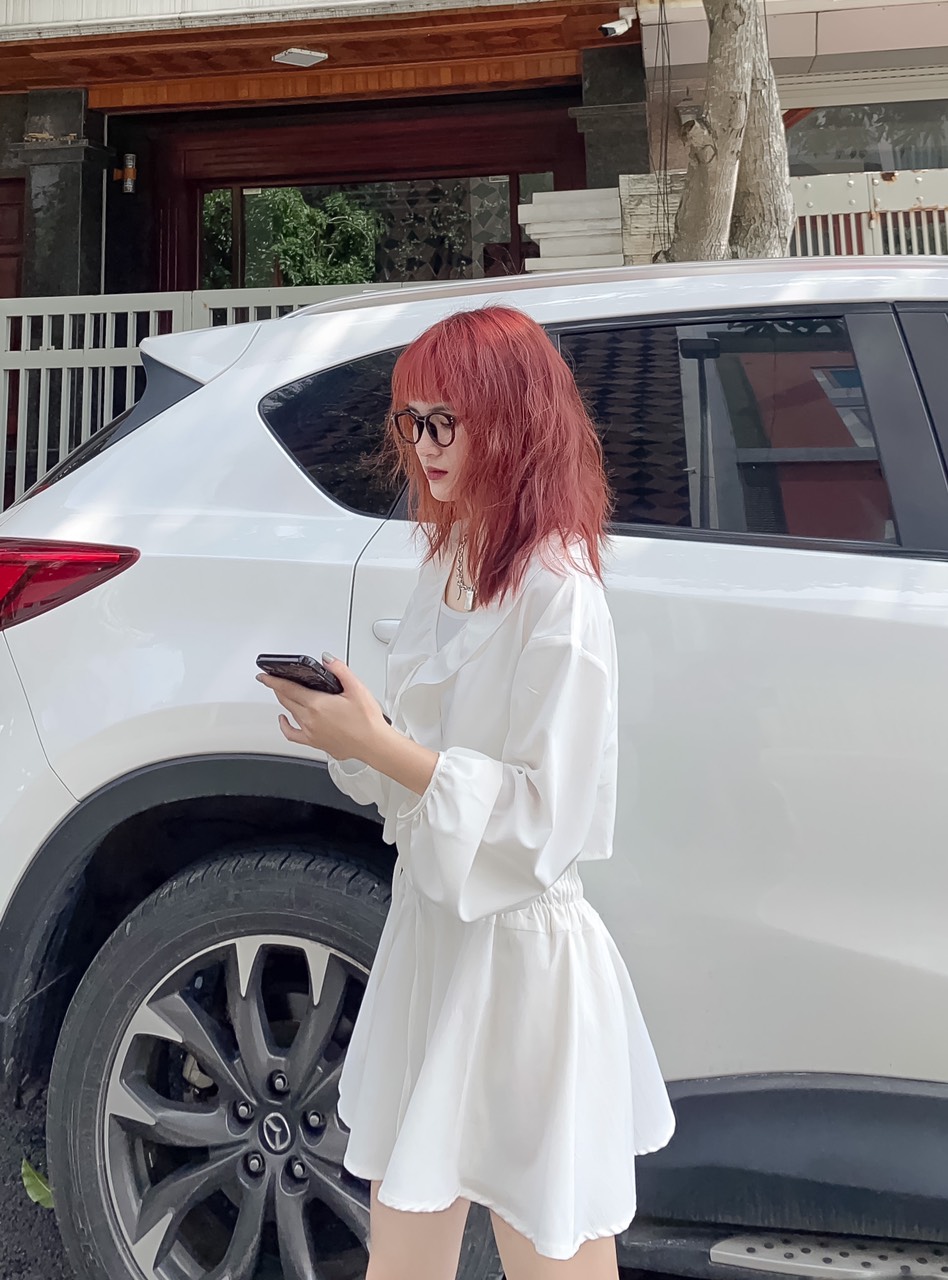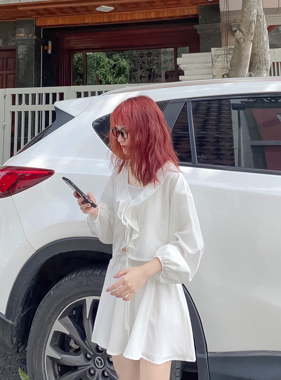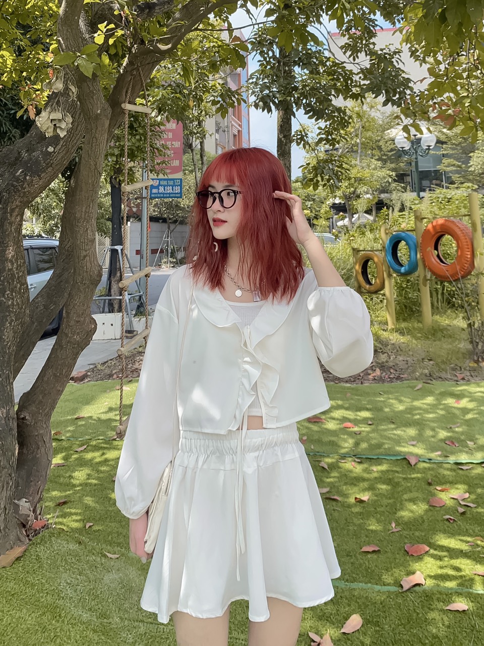 Sản phẩm madebymint chất vải nhuyễn mướt. Size S/M. Phần áo được thiết kế dúm bèo thắt dây nơ xinh, chân váy có quần đùi bên trong chống lộ.