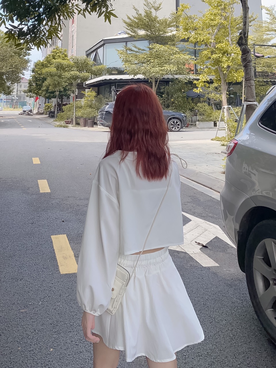 + M: Áo dài 40cm, rộng ngang 47cm / Chân váy dài 36cm, eo fit < 104cm
